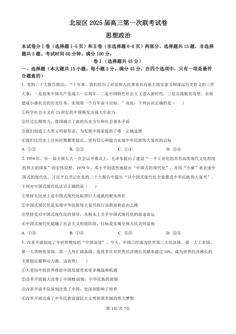 天津市北辰区2025届高三上学期11月期中考试政治(原卷版)