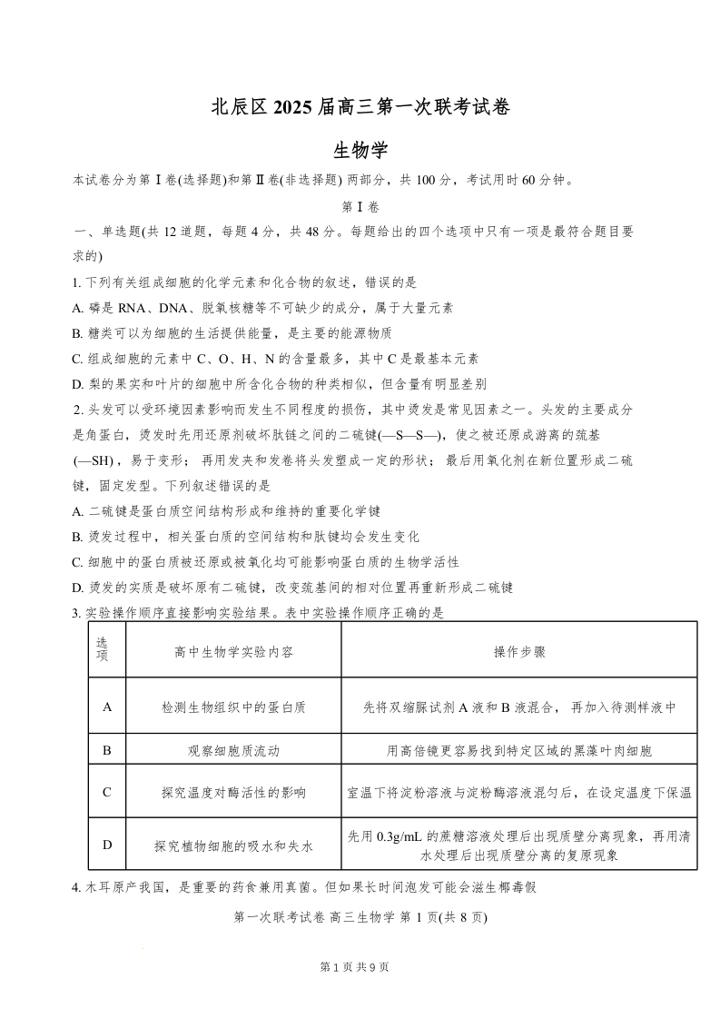 天津市北辰区2025届高三上学期11月期中考试生物+答案