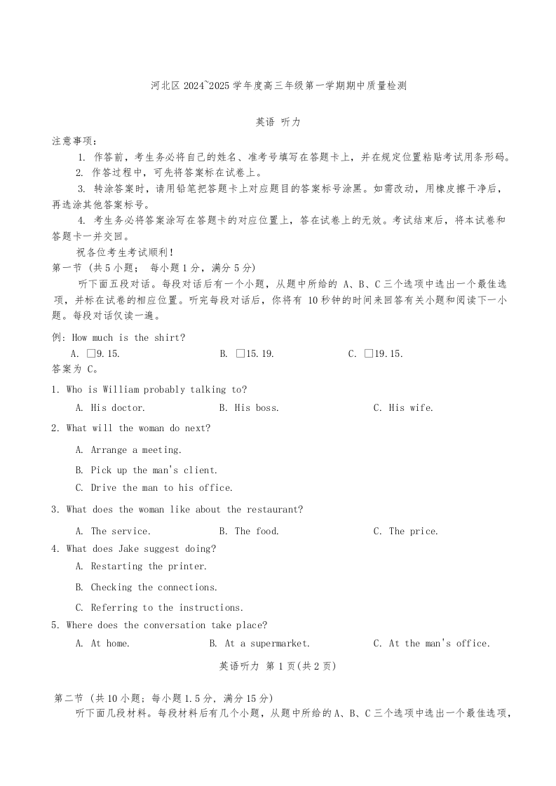 天津市河北区2025届高三上学期期中质量检测英语+答案