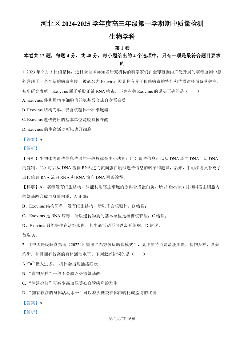 天津市河北区2025届高三上学期期中质量检测生物(精品解析版)
