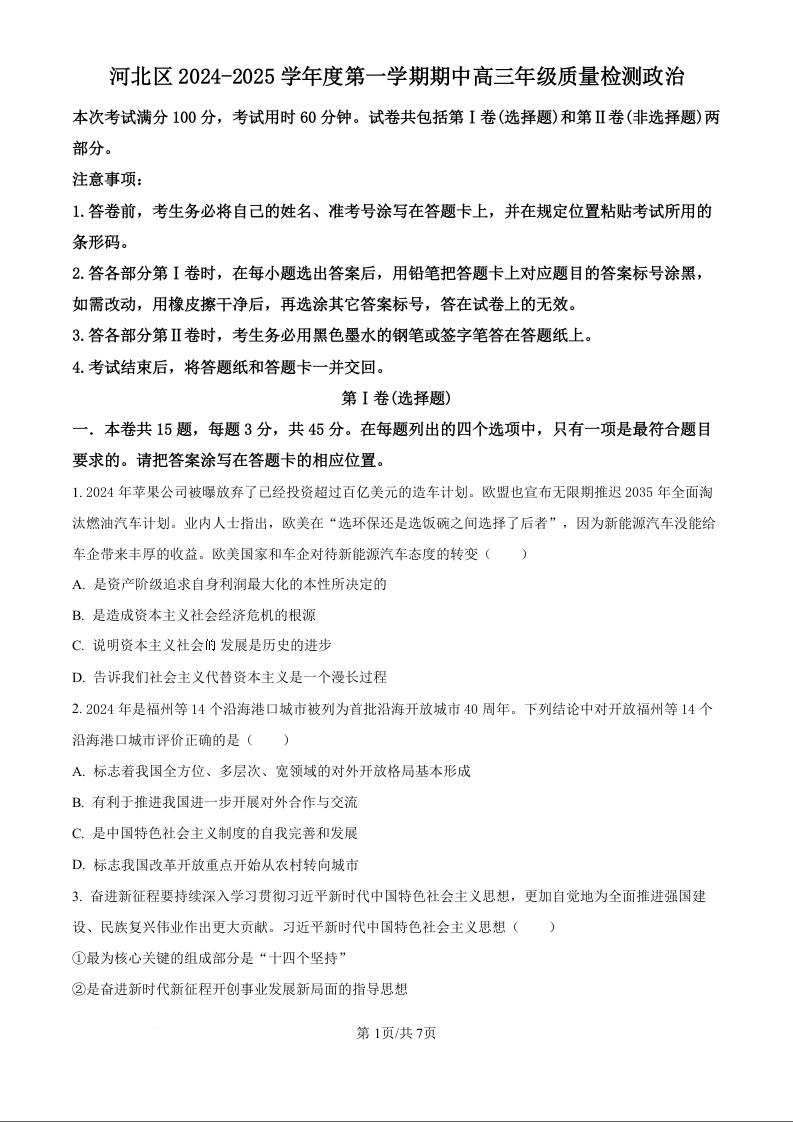 天津市河北区2025届高三上学期期中质量检测政治(原卷版)