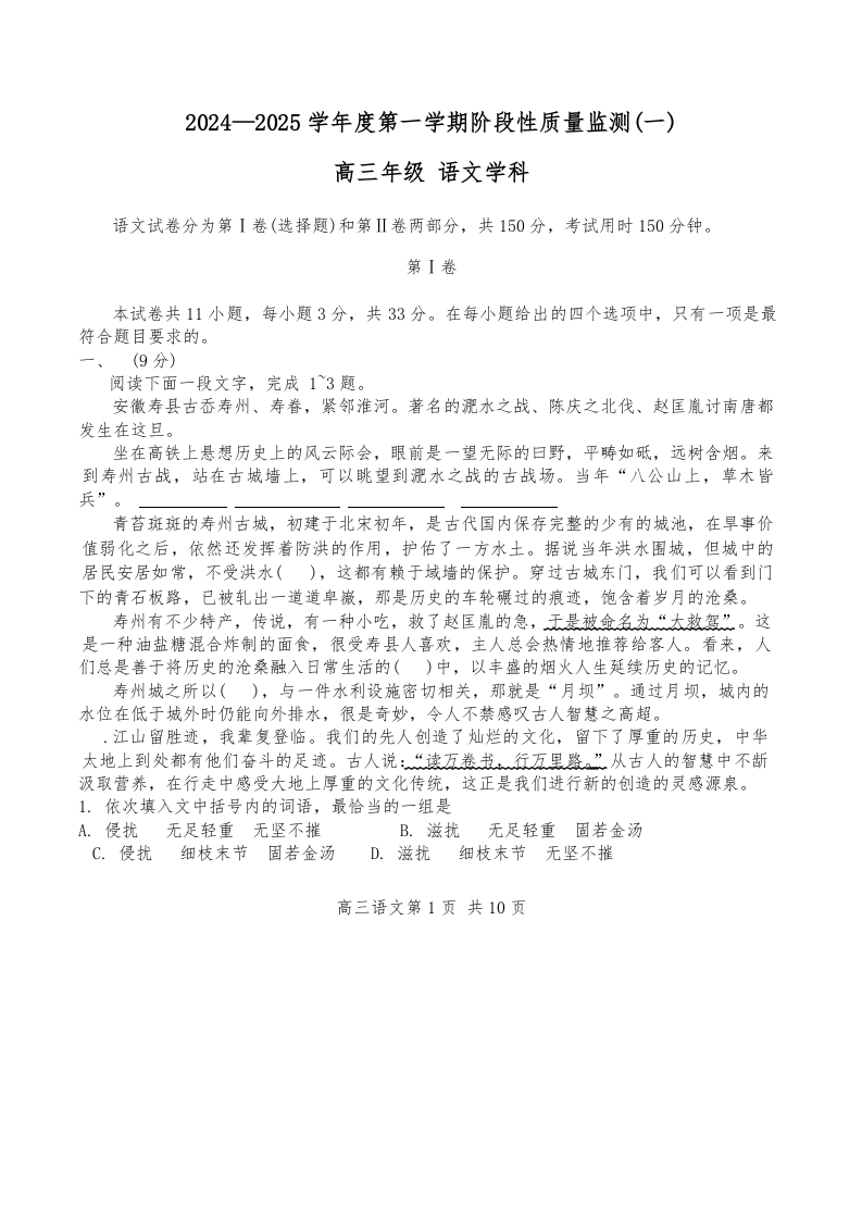 天津市南开区2025届高三上学期11月期中考试语文