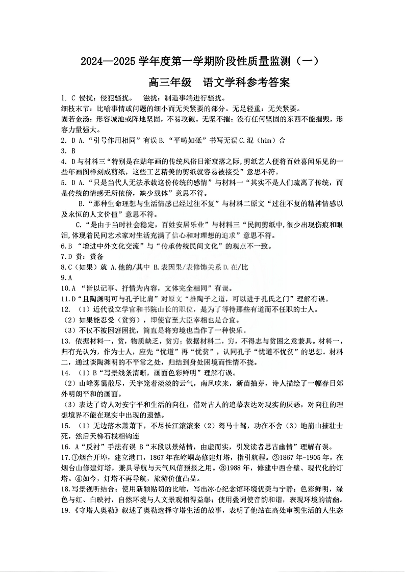 天津市南开区2025届高三上学期11月期中考试语文答案