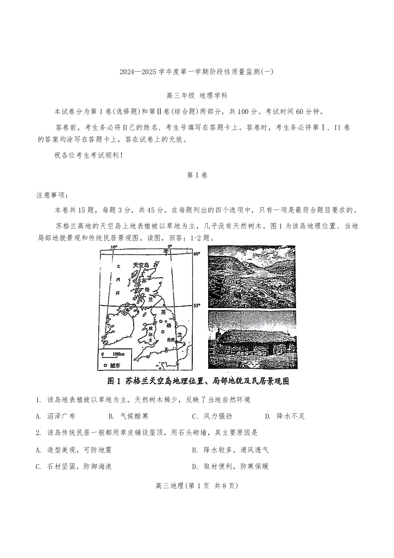 天津市南开区2025届高三上学期11月期中考试地理