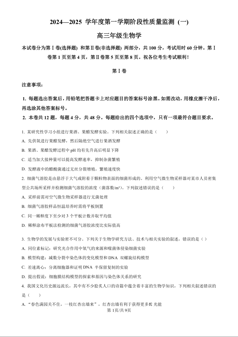 天津市南开区2025届高三上学期11月期中考试生物(原卷版)