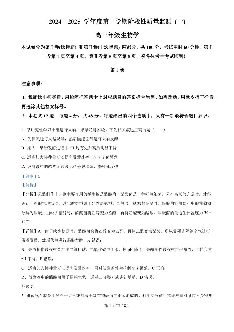 天津市南开区2025届高三上学期11月期中考试生物(精品解析版)