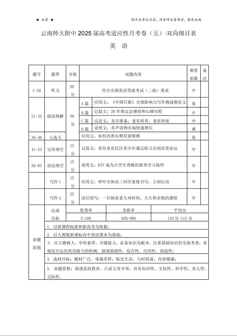 云南师范大学附属中学2025届高三高考适应性月考卷(五)英语双向细目表