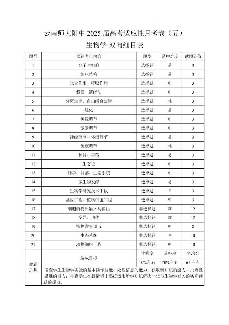 云南师范大学附属中学2025届高三高考适应性月考卷(五)生物(A卷)双向细目表