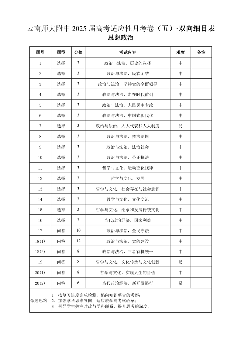 云南师范大学附属中学2025届高三高考适应性月考卷(五)政治(A卷)双向细目表