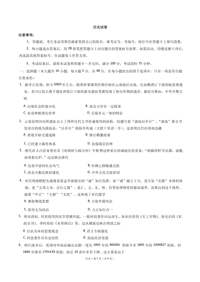 云南师范大学附属中学2025届高三高考适应性月考卷(五)历史+答案