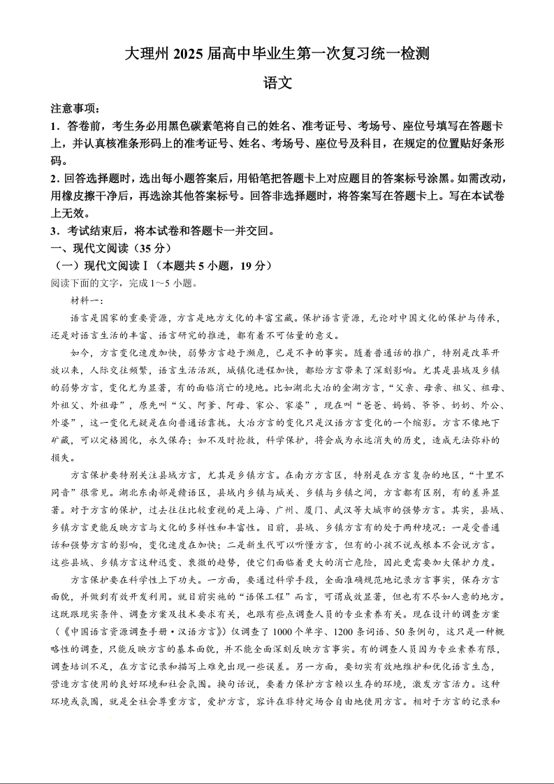 云南省大理州2025届高中毕业生第一次复习统一检测(大理一模)语文+答案