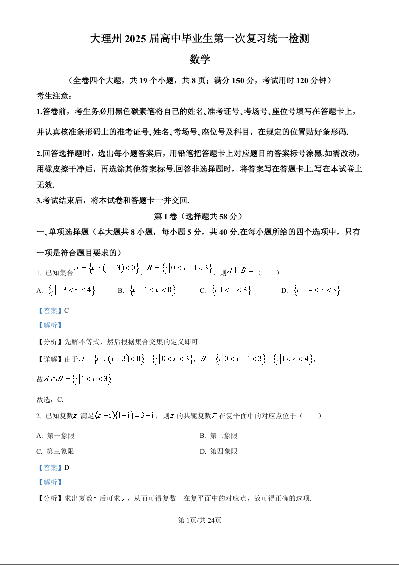 云南省大理州2025届高中毕业生第一次复习统一检测(大理一模)数学(精品解析版)