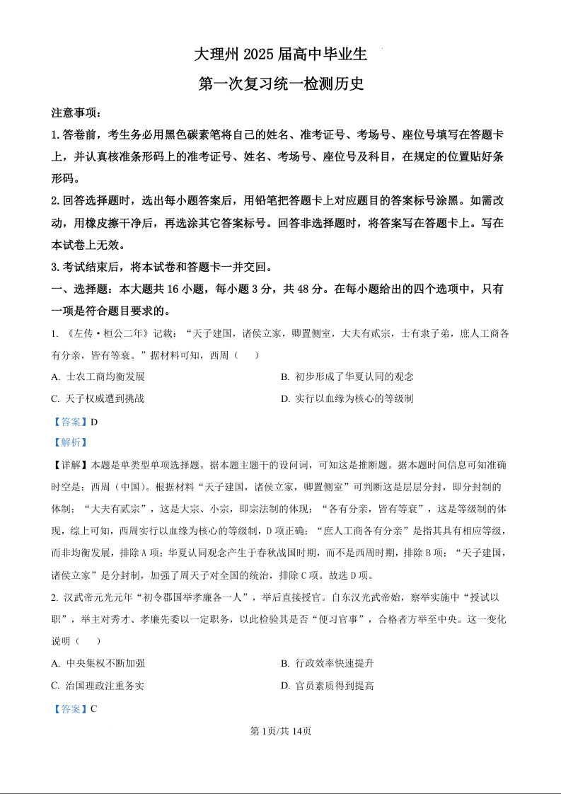 云南省大理州2025届高中毕业生第一次复习统一检测(大理一模)历史(精品解析版)