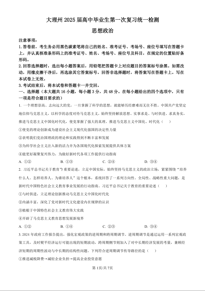 云南省大理州2025届高中毕业生第一次复习统一检测(大理一模)政治(原卷版)
