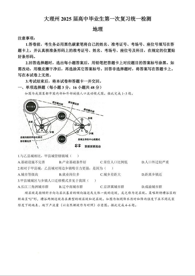 云南省大理州2025届高中毕业生第一次复习统一检测(大理一模)地理+答案