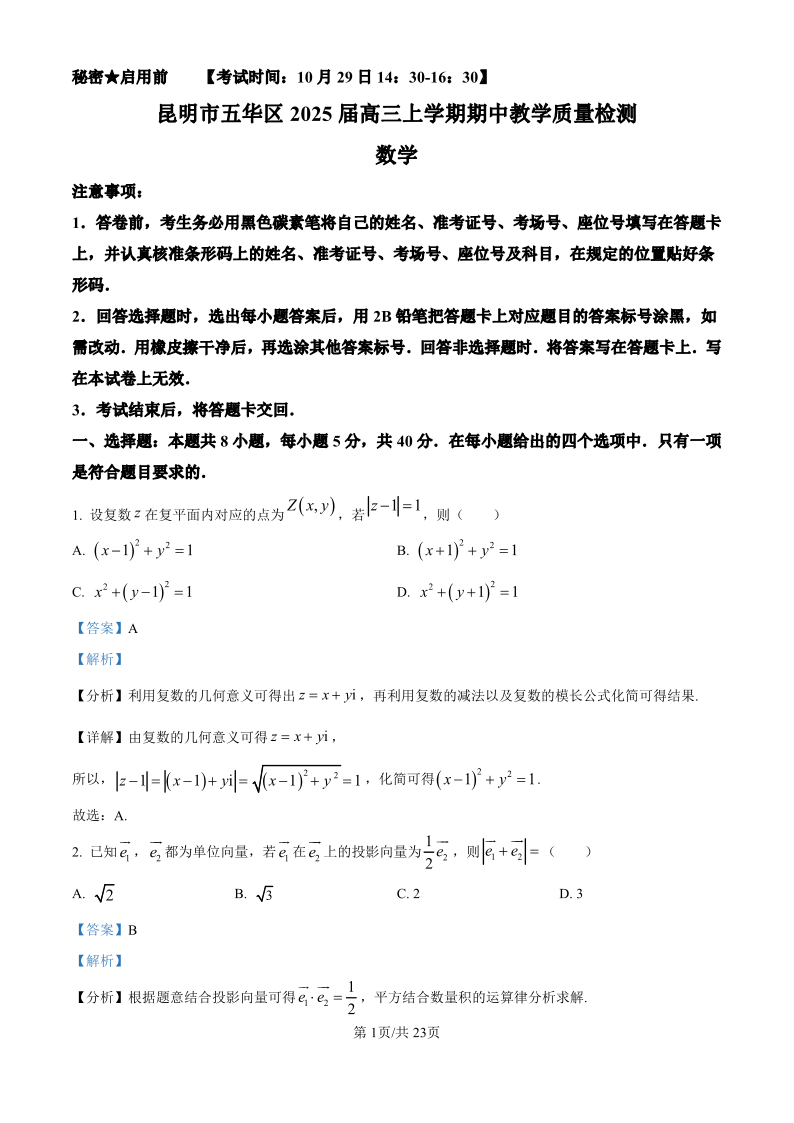 云南省昆明市五华区2024-2025学年高三上学期期中教学质量检测数学(精品解析版)