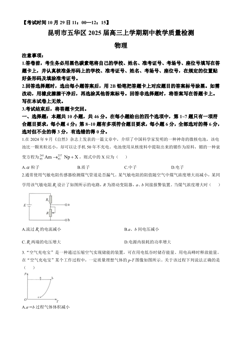 云南省昆明市五华区2025届高三上学期期中教学质量检测物理+答案