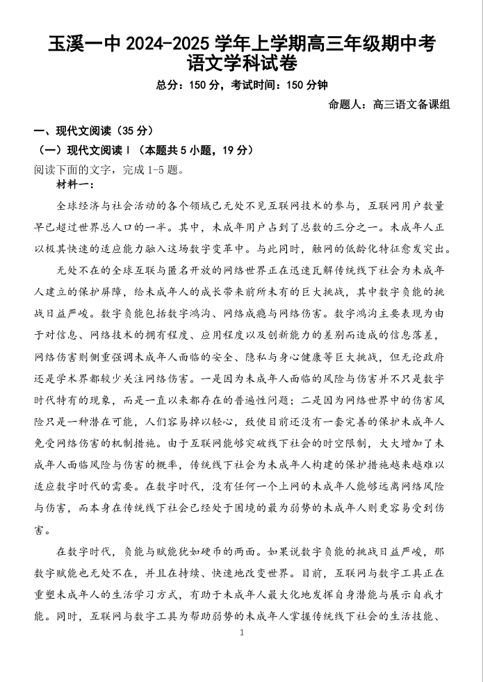 云南省玉溪市一中2025届高三上学期11月期中考试语文