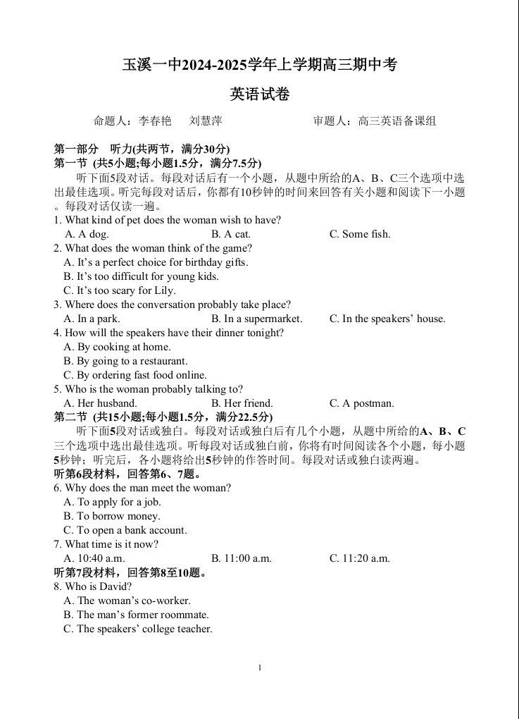 云南省玉溪市一中2025届高三上学期11月期中考试英语
