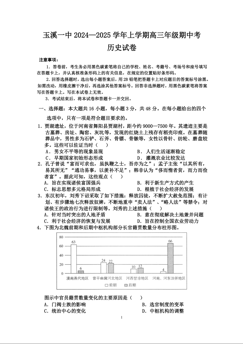 云南省玉溪市一中2025届高三上学期11月期中考试历史
