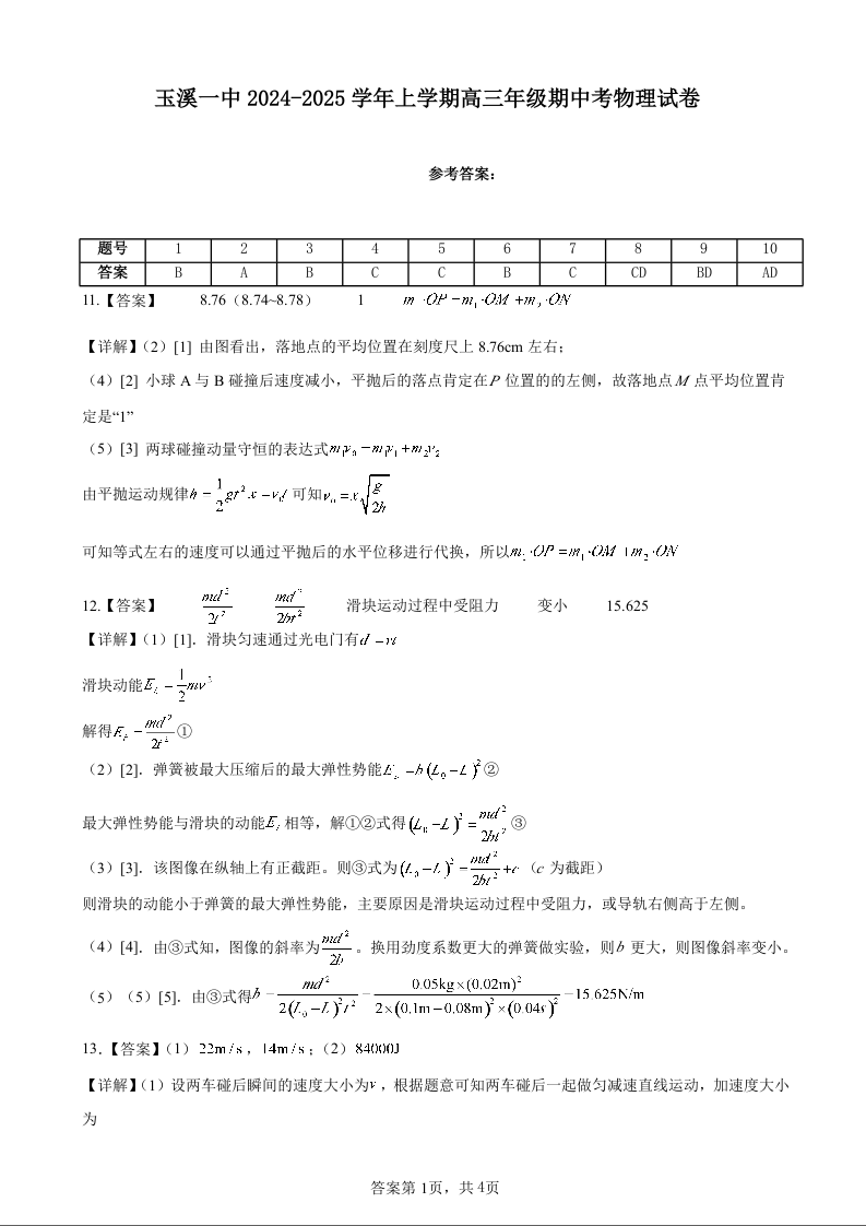 云南省玉溪市一中2025届高三上学期11月期中考试物理答案