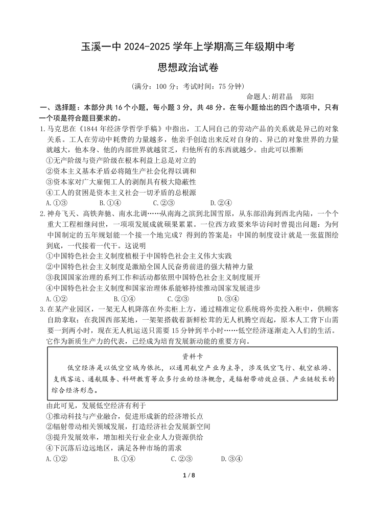 云南省玉溪市一中2025届高三上学期11月期中考试政治