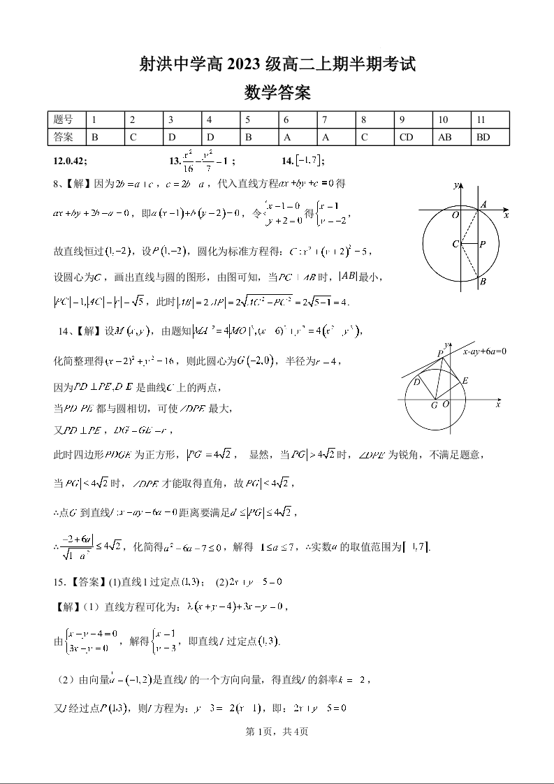 四川省遂宁市射洪中学高2023级高二上期半期考试数学答案