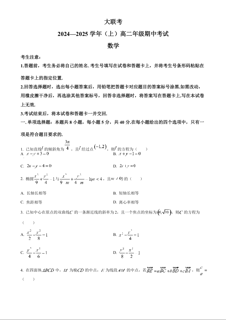 河南省区域高中大联考2024-2025学年高二上学期11月期中考试数学(原卷版)