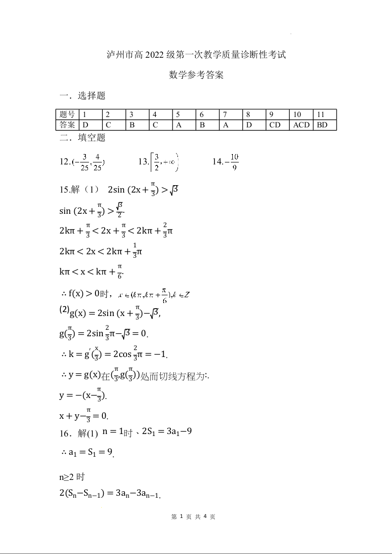 四川省泸州市高2022级第一次教学质量诊断性考试数学答案
