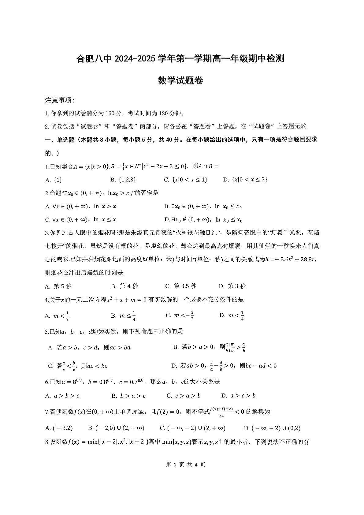 安徽省合肥八中2024-2025学年第一学期高一年级期中检测数学
