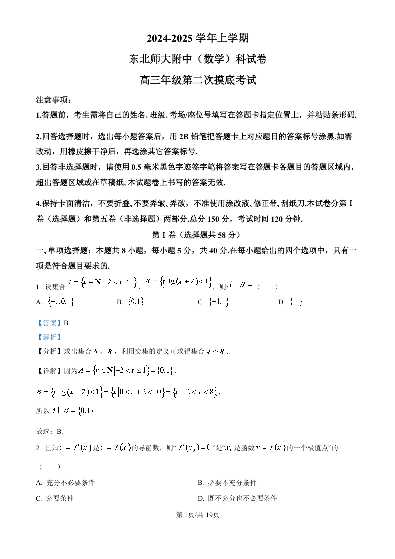 吉林省东北师范大学附属中学2025届高三上学期第二次摸底考试数学(精品解析版)