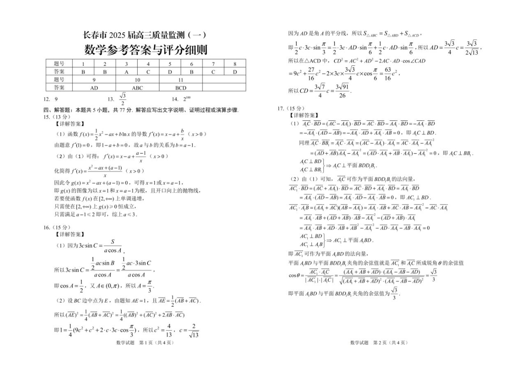 吉林省长春市2025届高三上学期质量监测(一)数学答案