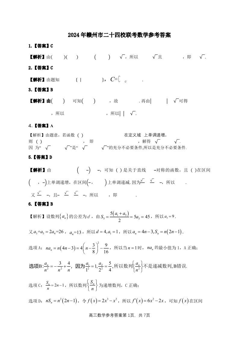 江西省赣州市十八县(市、区)二十四校2025届高三上学期期中考试数学答案