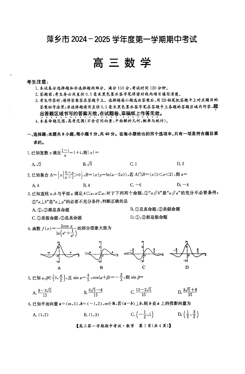 江西省萍乡市2025届高三上学期11月期中考试数学
