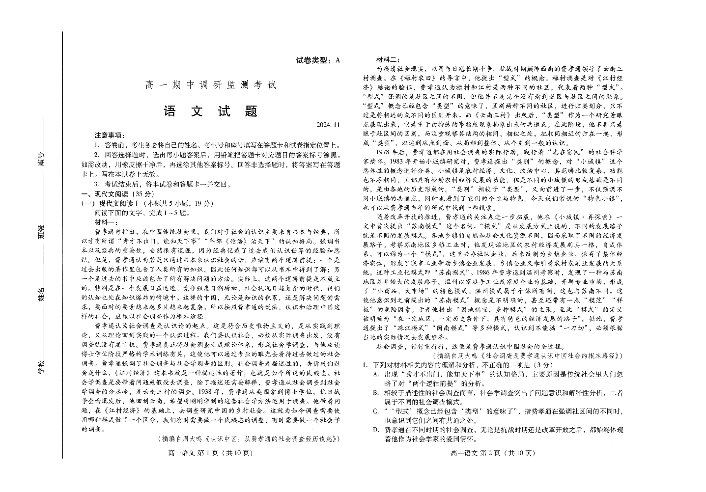 山东省潍坊市2024.11高一期中调研监测考试语文