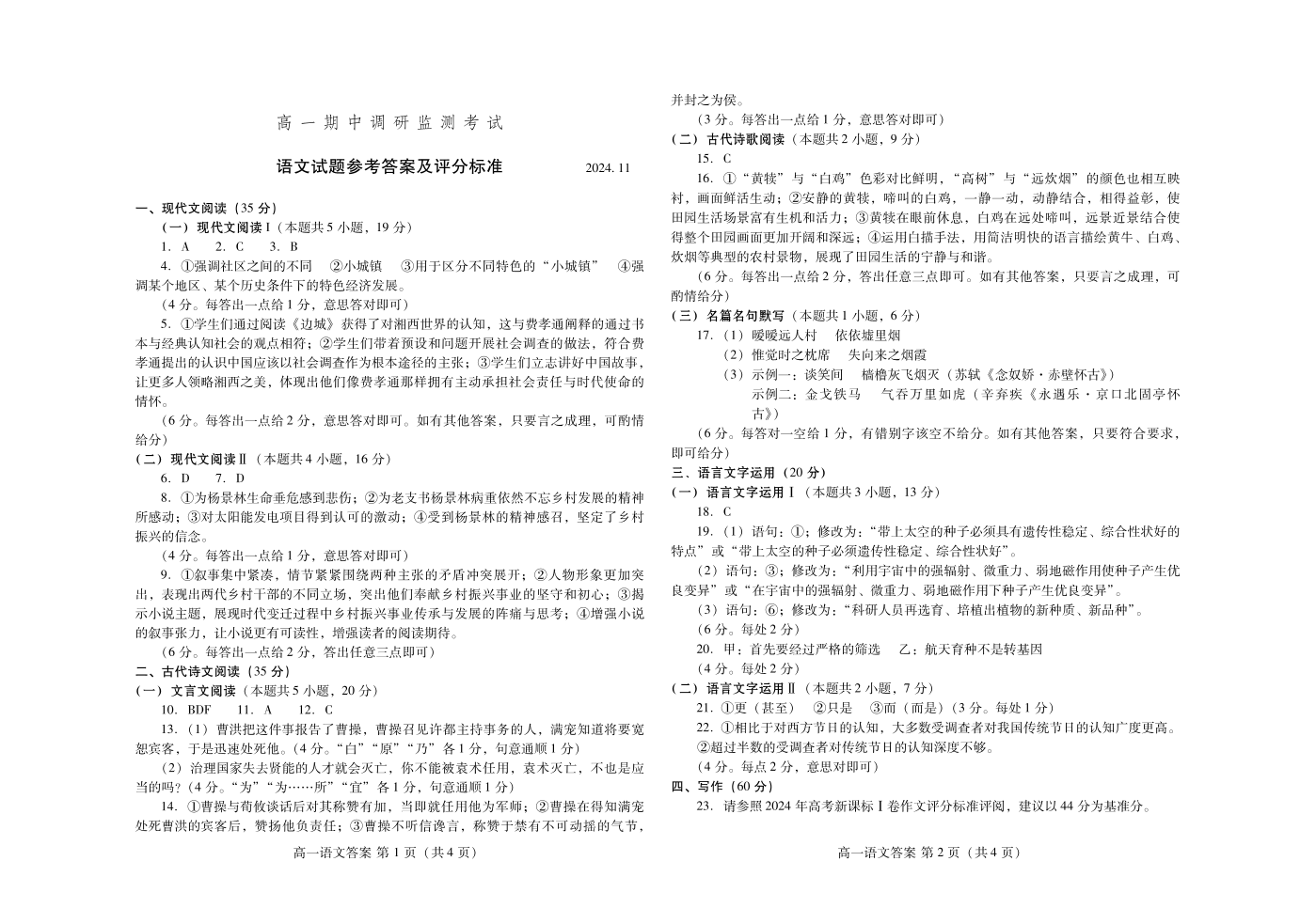 山东省潍坊市2024.11高一期中调研监测考试语文答案