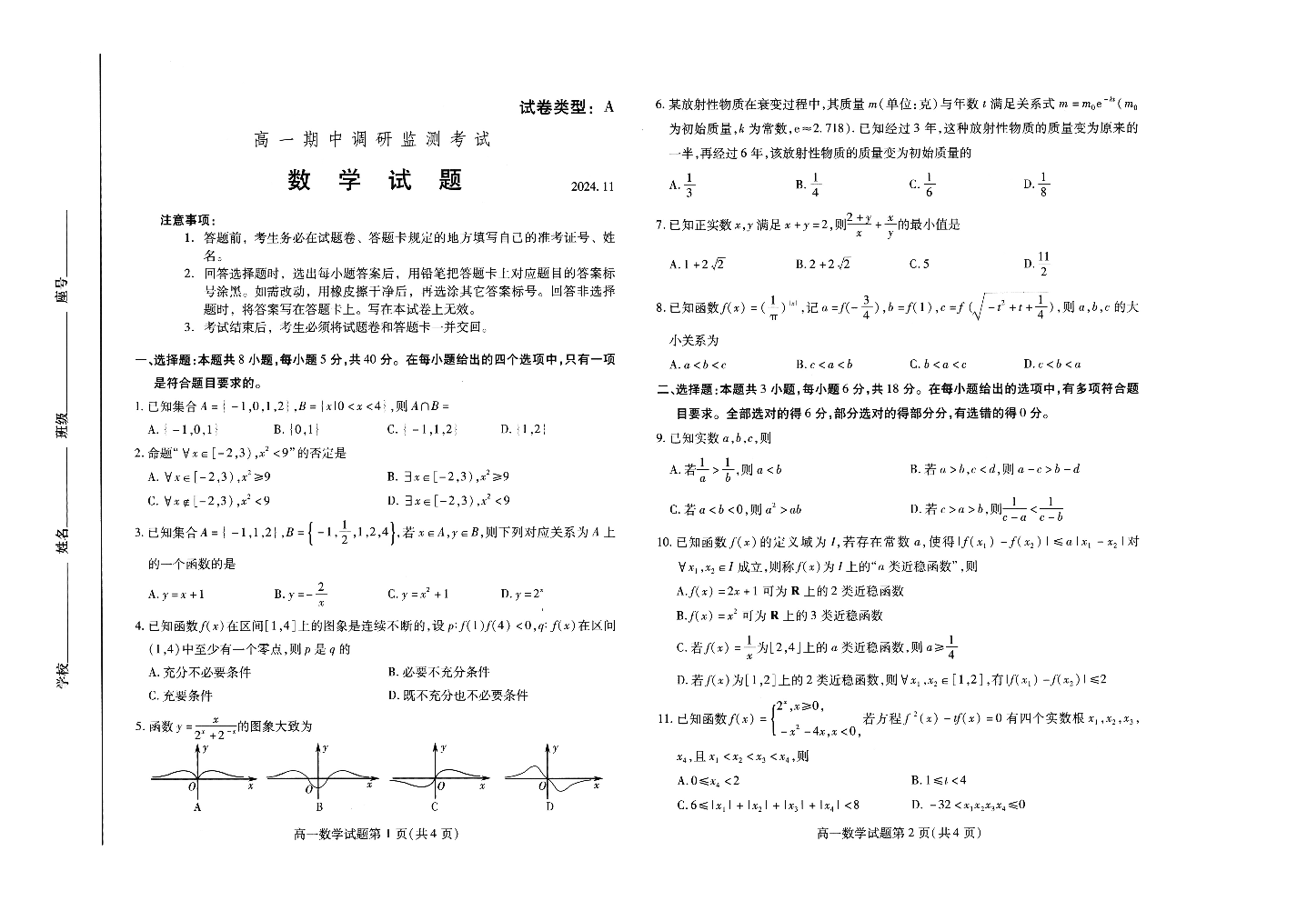 山东省潍坊市2024.11高一期中调研监测考试数学