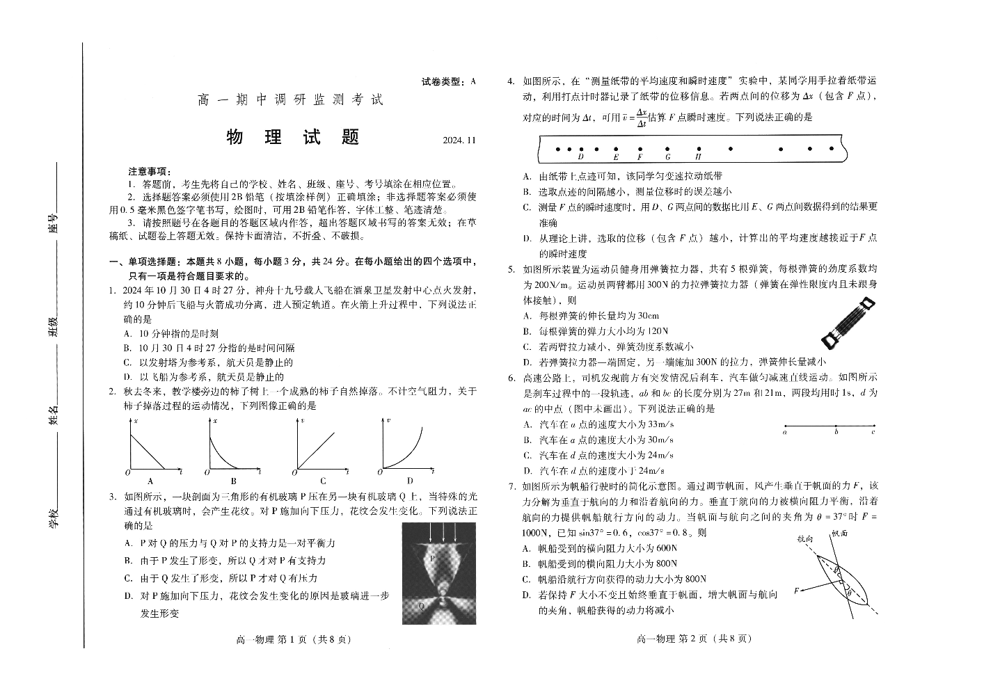 山东省潍坊市2024.11高一期中调研监测考试物理