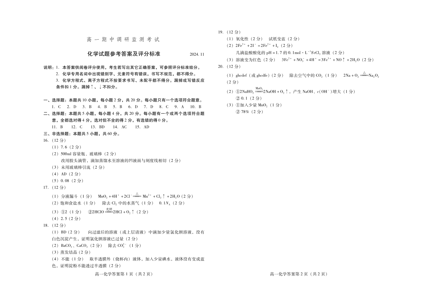 山东省潍坊市2024.11高一期中调研监测考试化学答案