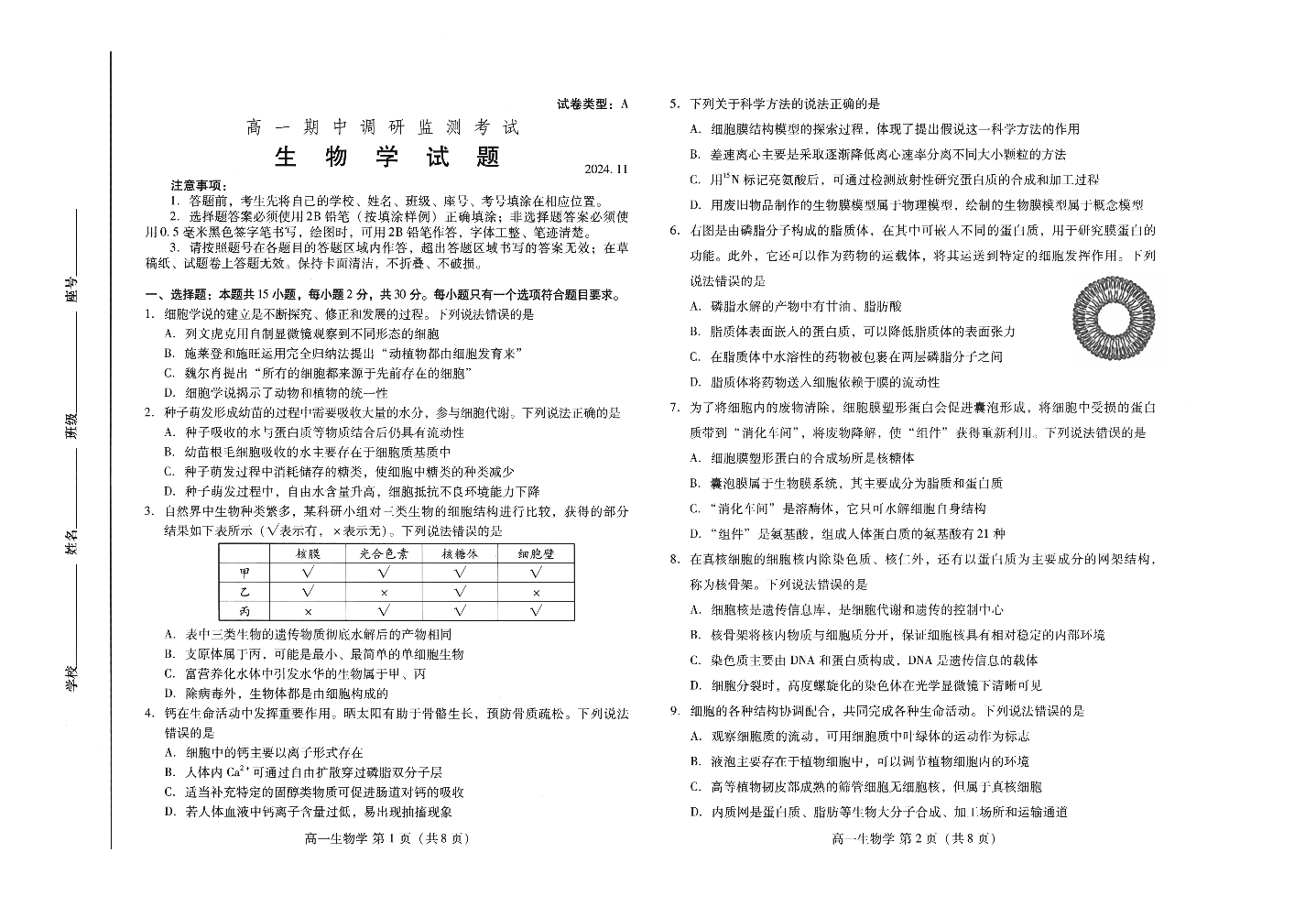 山东省潍坊市2024.11高一期中调研监测考试生物学