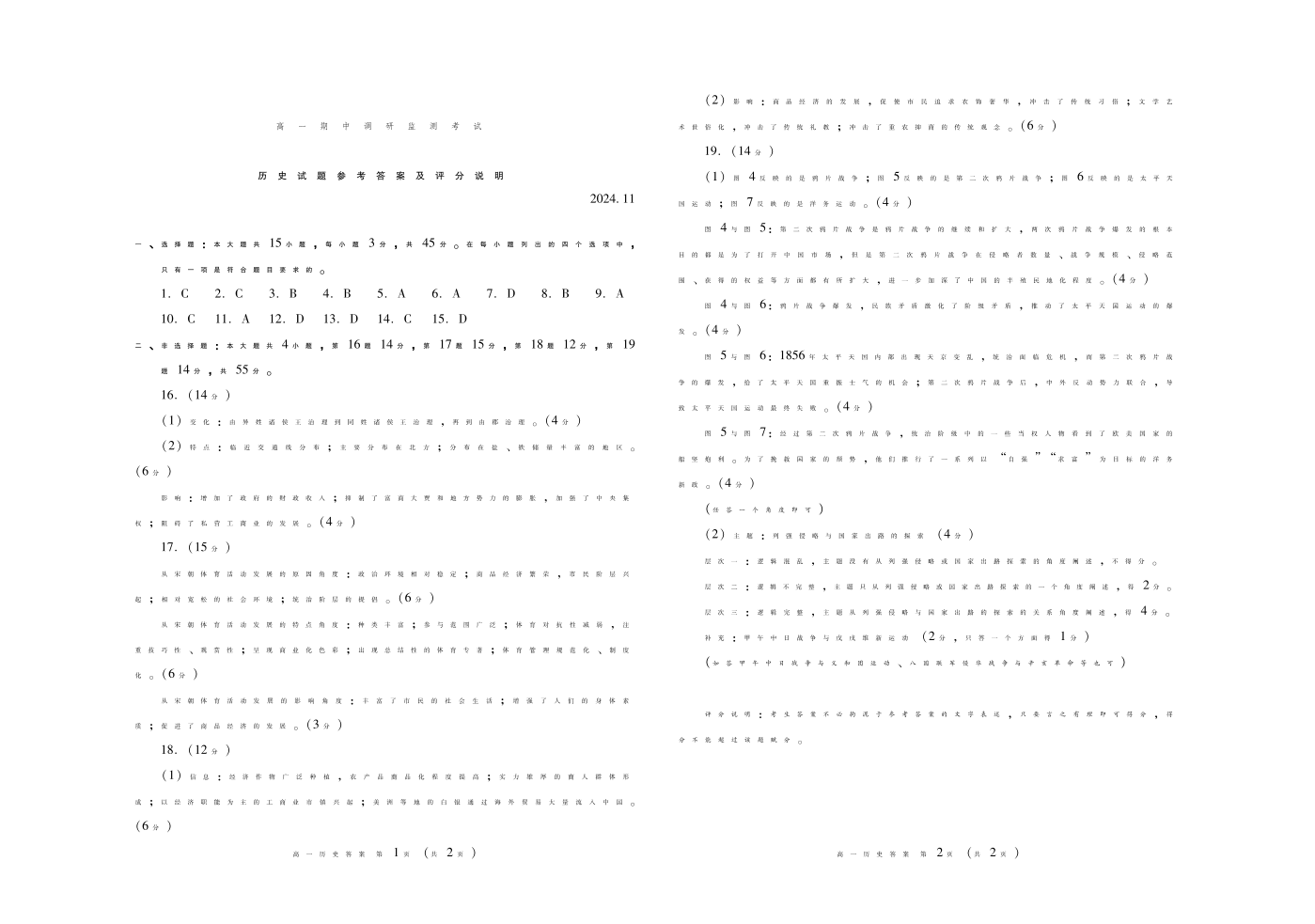 山东省潍坊市2024.11高一期中调研监测考试历史答案