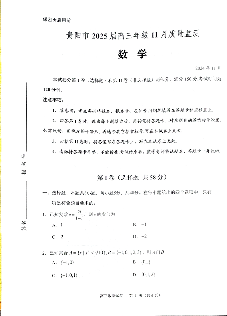 贵州省贵阳市2025届高三年级上学期11月质量监测数学