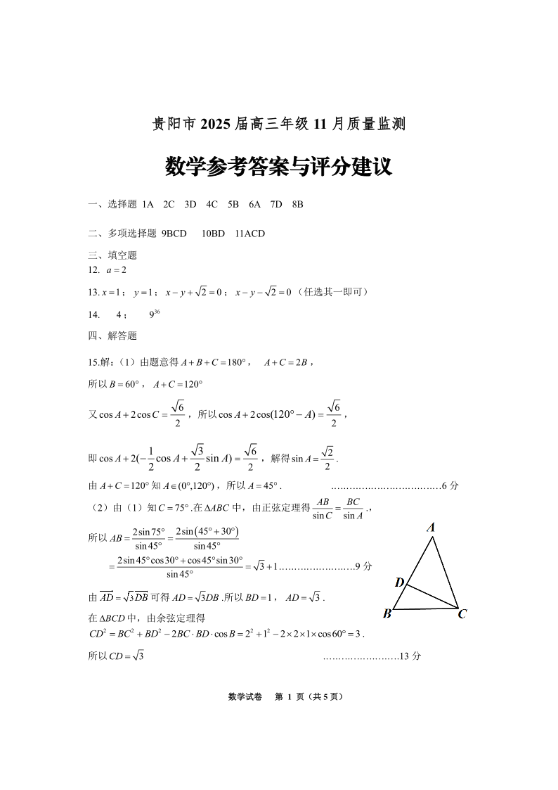 贵州省贵阳市2025届高三年级上学期11月质量监测数学答案