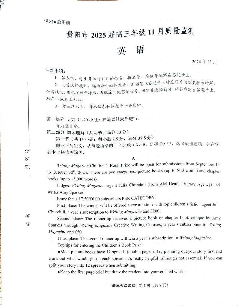 贵州省贵阳市2025届高三年级上学期11月质量监测英语