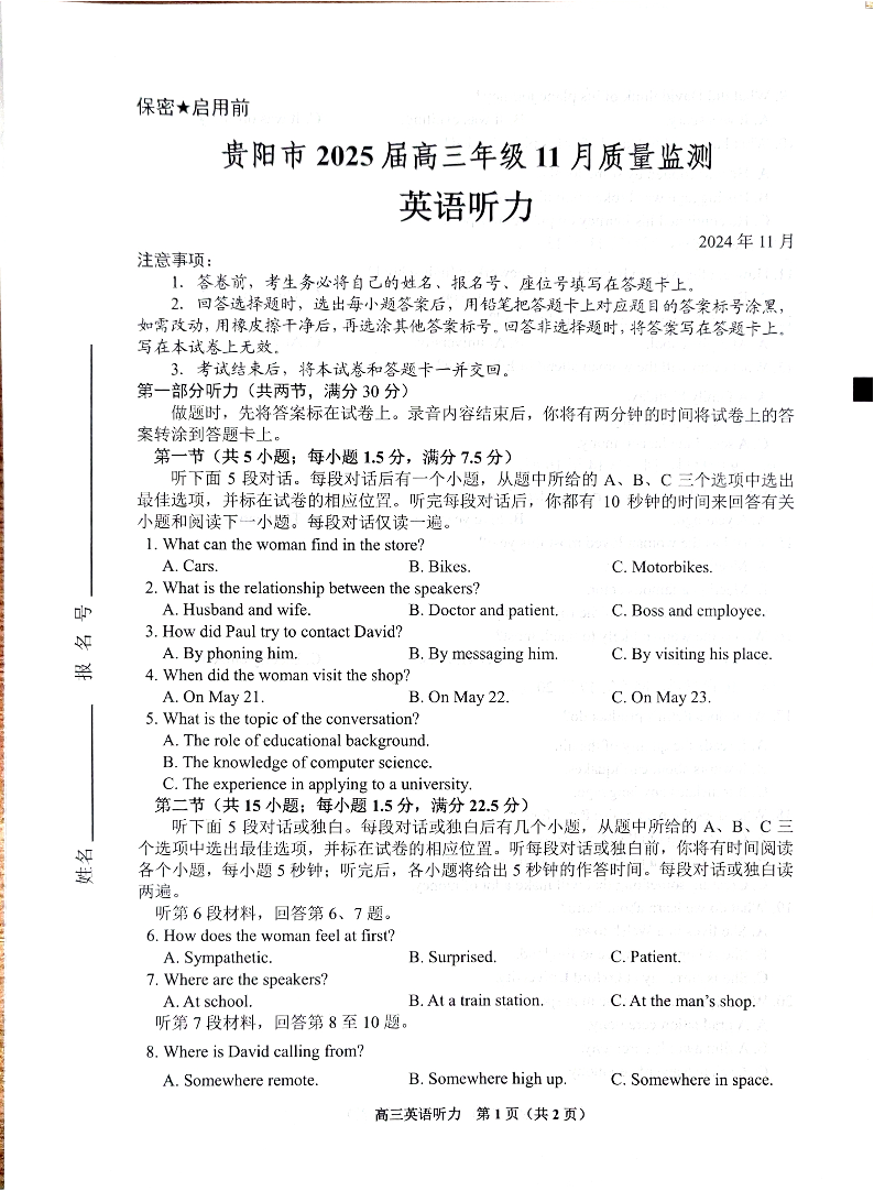 贵州省贵阳市2025届高三年级上学期11月质量监测听力试题