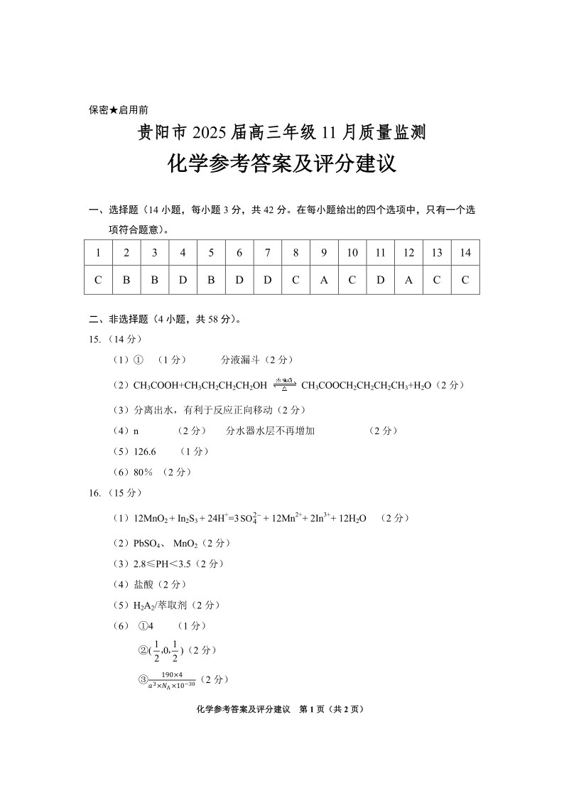 贵州省贵阳市2025届高三年级上学期11月质量监测化学答案