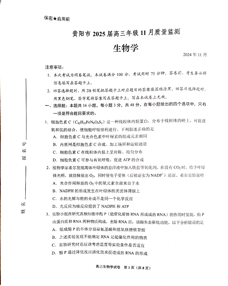贵州省贵阳市2025届高三年级上学期11月质量监测生物
