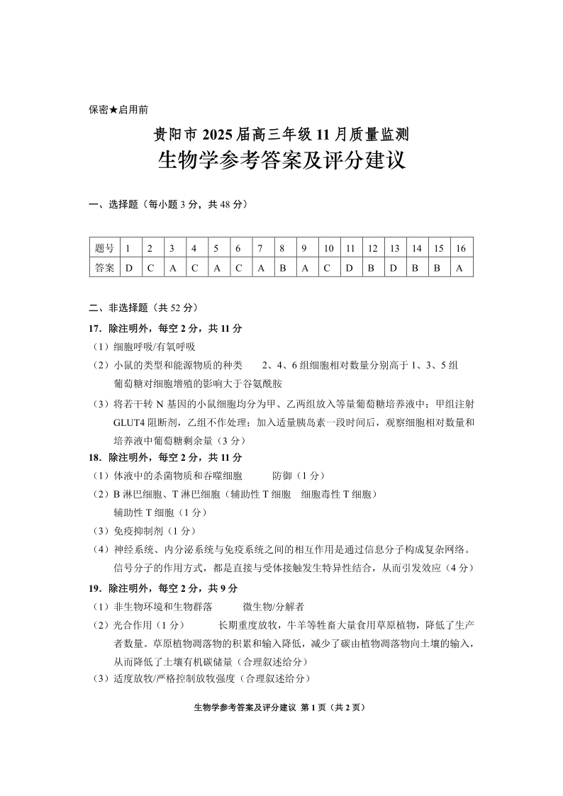 贵州省贵阳市2025届高三年级上学期11月质量监测生物答案