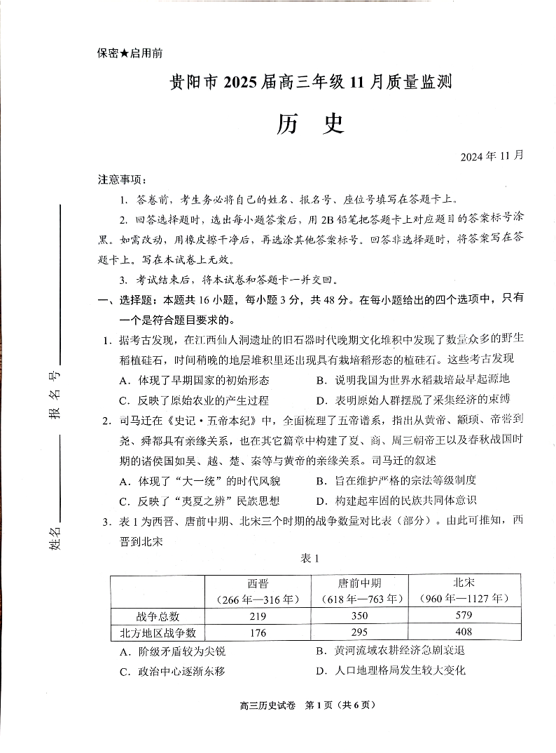 贵州省贵阳市2025届高三年级上学期11月质量监测历史