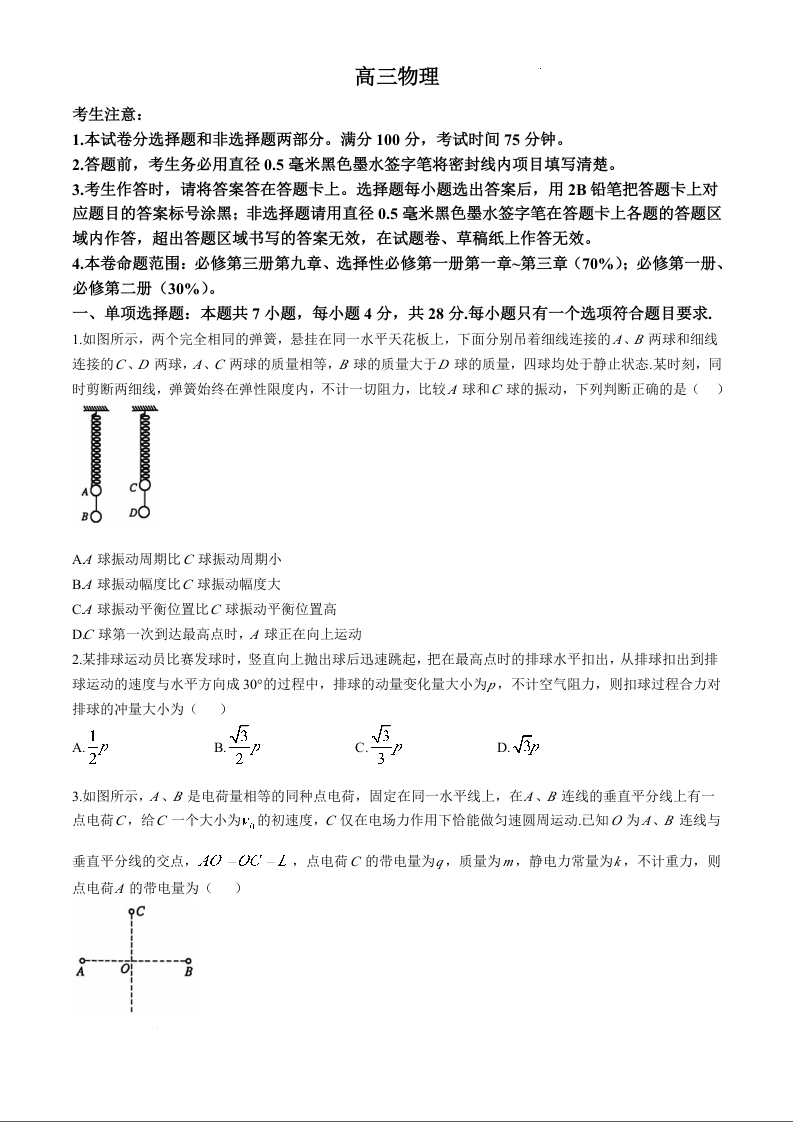 河南省区域高中2025届高三年级11月质量检测(九师联盟)物理+答案